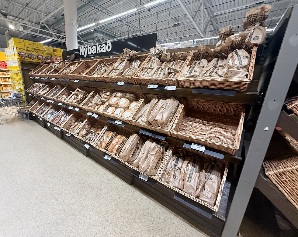 Verslunarhillur brauð & kökur - H157 x B120 x D60 sm - 25 lengdarmetrar